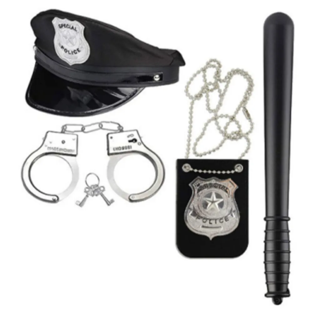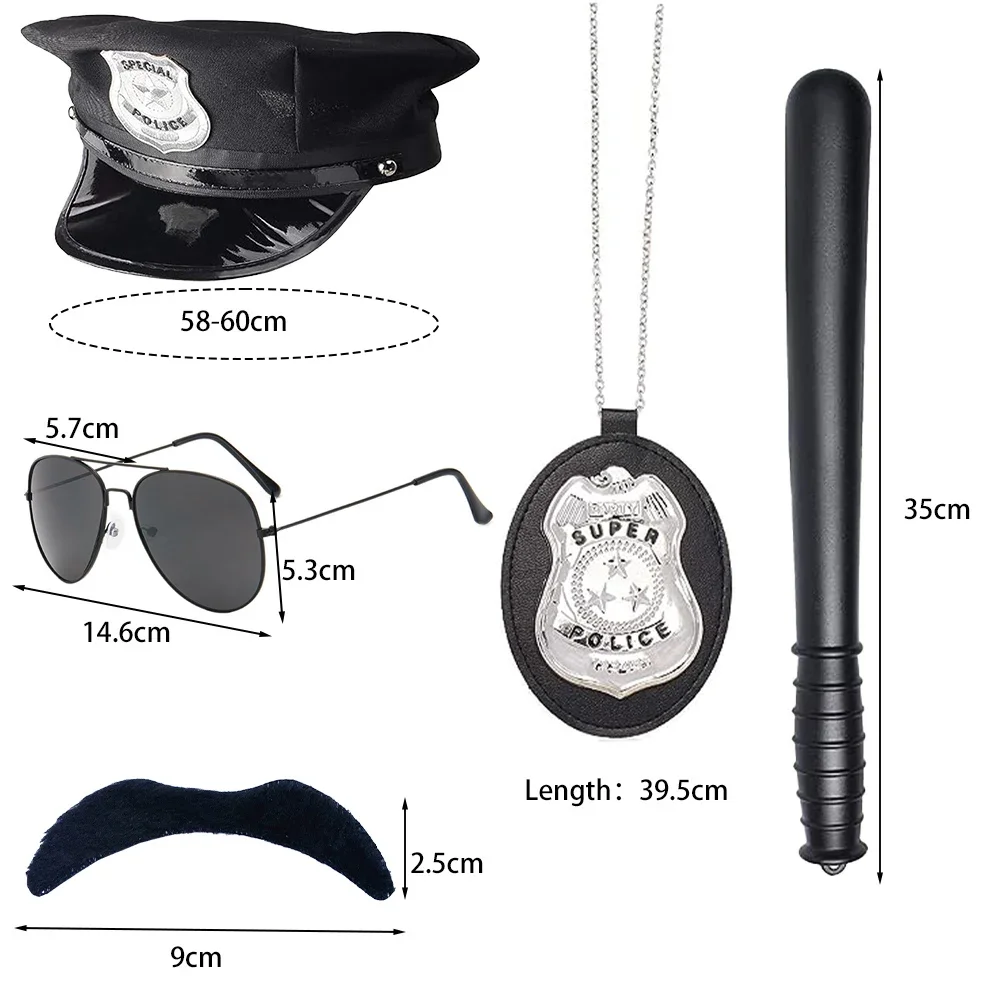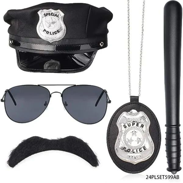 Ensemble policier complet : chapeau, bâton, badge, lunettes de soleil et moustache
